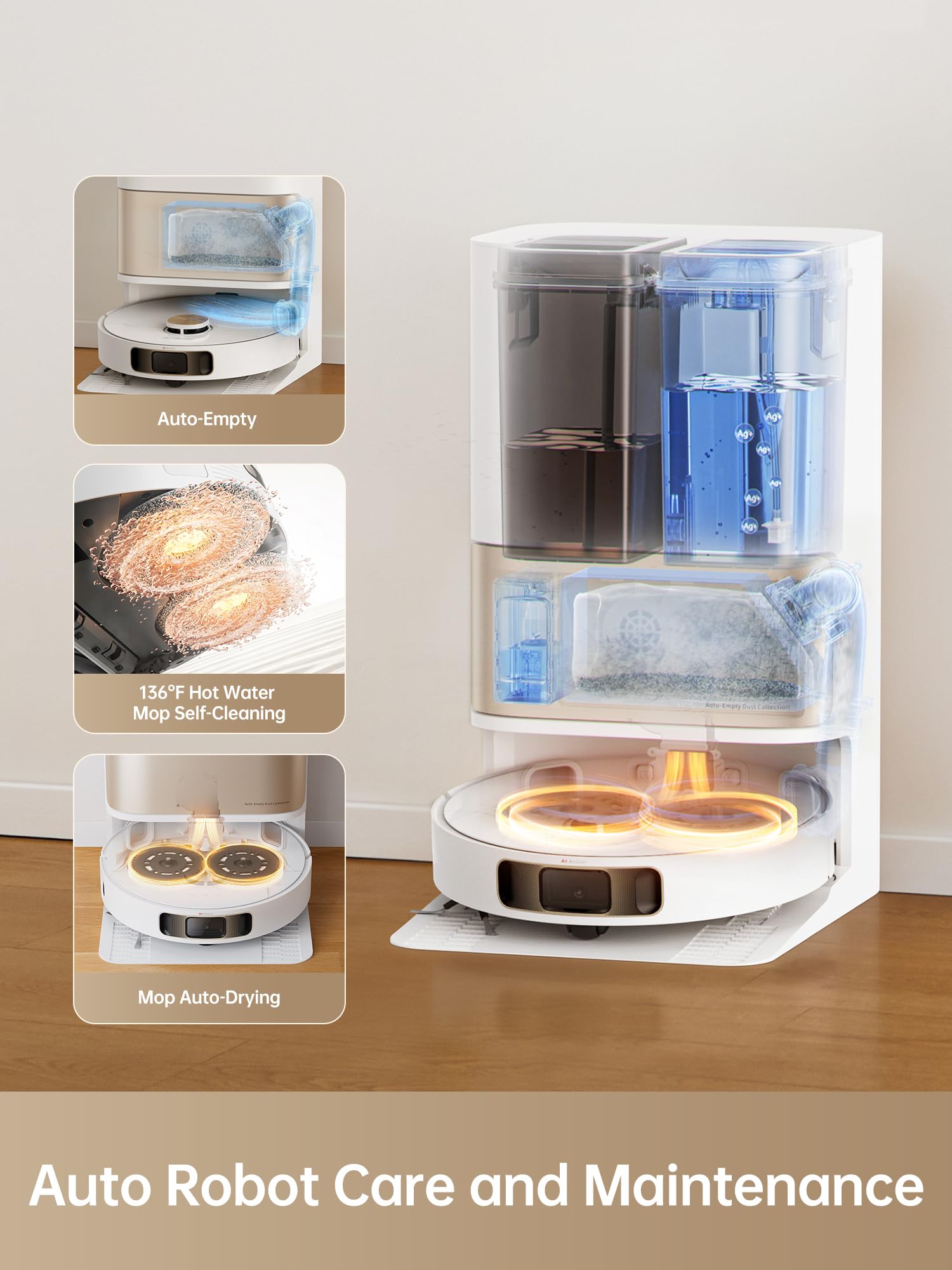 - Easy Robot Care with Hot Water: Ease a household burden with automatic robot care. Clean the mops with hot water and dry them with hot air.