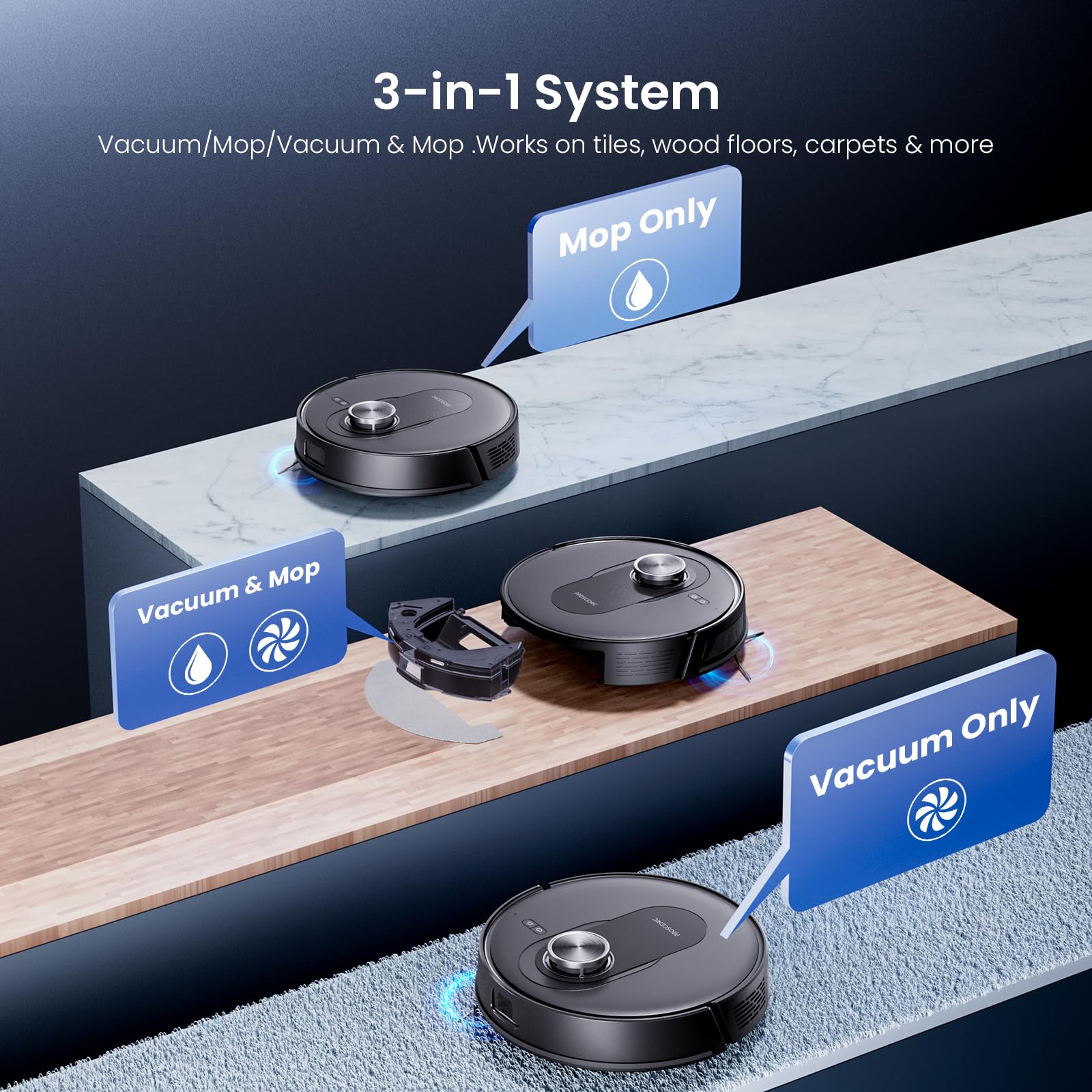- 【All-in-One Cleaning, 60 Days Hands-Free】The robot vacuum and mop integrates vacuuming, mopping, and post-use automatic dustbin emptying into one (3L dust bag can be cleaned hands-free for up to 60 days.). Features Zigzag & Matrix clean modes for sparkling clean and dust-free floors, making it one of the most efficient robotic vacuums on the market